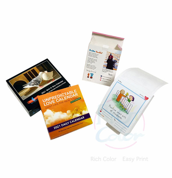 Shenzhen Rich Colour Printing tilbyr en avansert 365 dagers side om dagen å rive av kalenderutskriftstjeneste til en svært rimelig pris. Send oss kalenderdetaljene dine for å få et tilbud, og vi vil veilede deg til å lage en flott 365 dagers side en dag som rives av kalenderen.